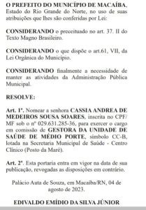 Do outro lado da família tudo está da mesma forma com as nomeações de Antônio França Sobrinho como dentista do ESF Campo da Mangueira e sua esposa Rozineide Rodrigues de Moraes como Gestora do Caps AD.